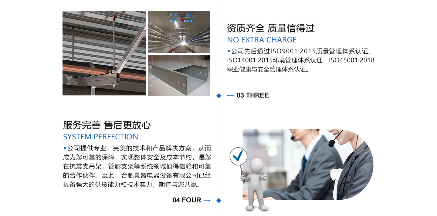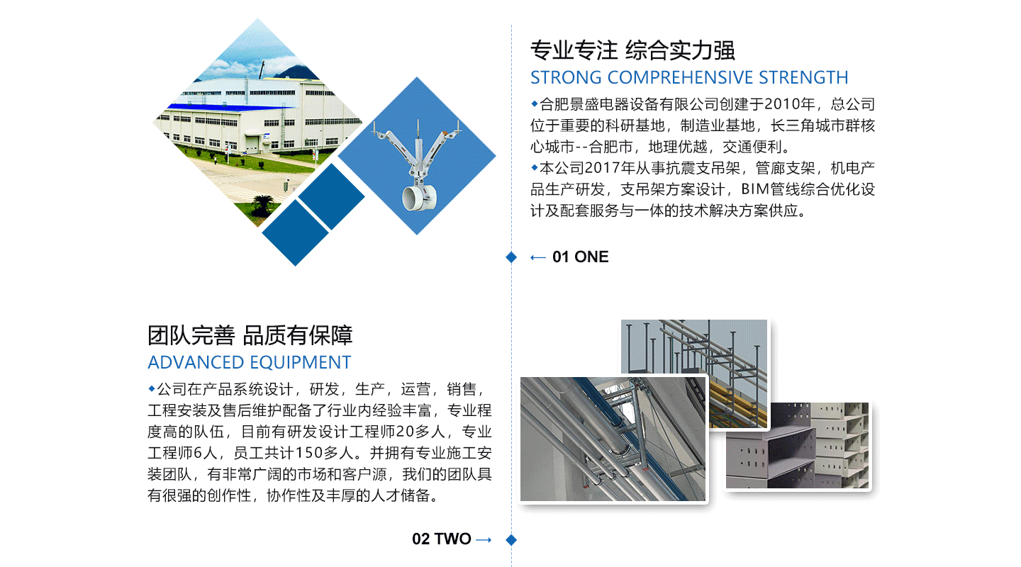 合肥景盛電器設備有限公司創(chuàng)建于2011年,注冊資本3000萬,總公司位于中國重要的科研基地,制造業(yè)基地,長三角城市群中心城市-----合肥市,地理位置好,交通方便。本公司2017年從事抗震支吊架,電纜橋架,機電產(chǎn)品生產(chǎn)研發(fā),支吊架方案設計,BIM管線綜合優(yōu)化設計及配套服務與一體的技術解決方案供應。公司在產(chǎn)品系統(tǒng)設計,研發(fā),生產(chǎn),運營,銷售,工程安裝及售后維護配備了行業(yè)內經(jīng)驗豐富,服務程度高的隊伍,目前有研發(fā)設計工程師20多人,工程師6人,員工共計150多人。并擁有施工安裝團隊,有非常廣闊的市場和客戶源,我們的團隊具有很強的創(chuàng)作性,協(xié)作性及豐厚的人才儲備。 公司先后通過ISO9001:2015質量管理體系認證...
